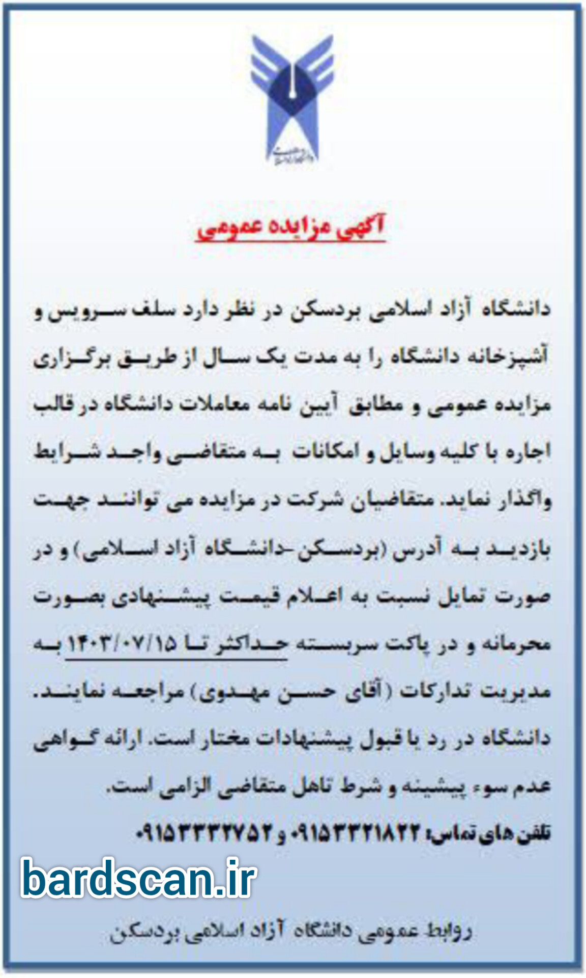 مزایده عمومی سلف سرویس و آشپزخانه دانشگاه آزاداسلامی بردسکن