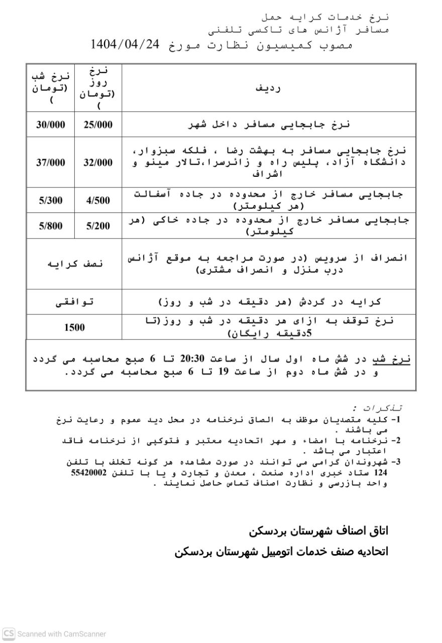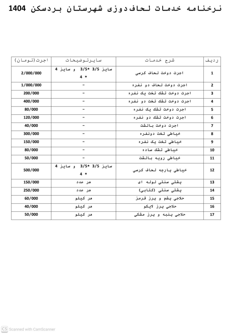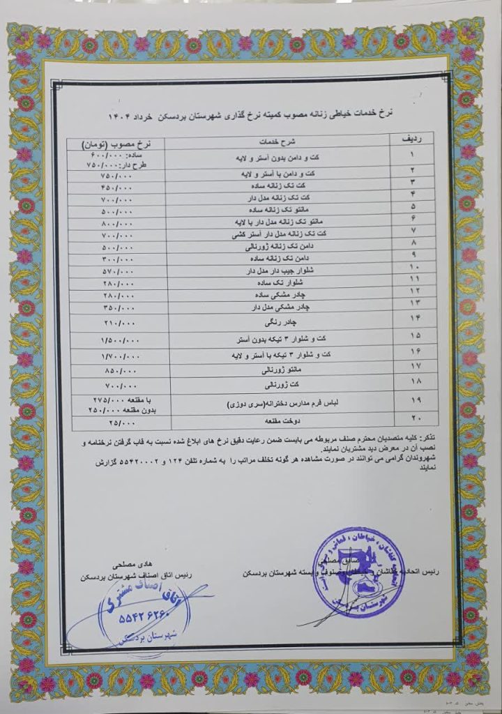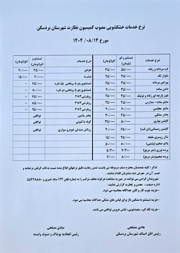اعلام نرخ اتحادیههای شهرستان بردسکن در سال ۱۴۰۴