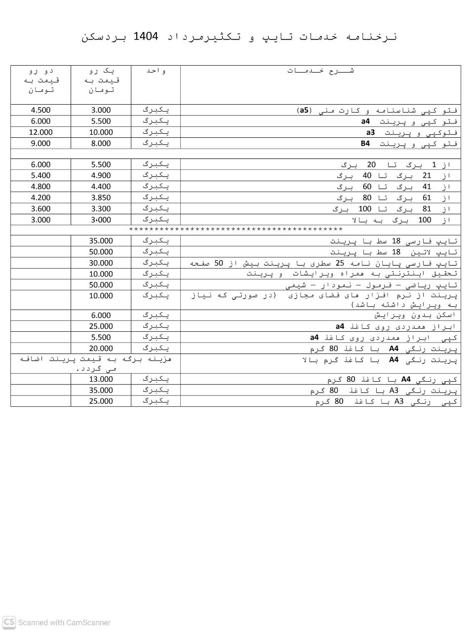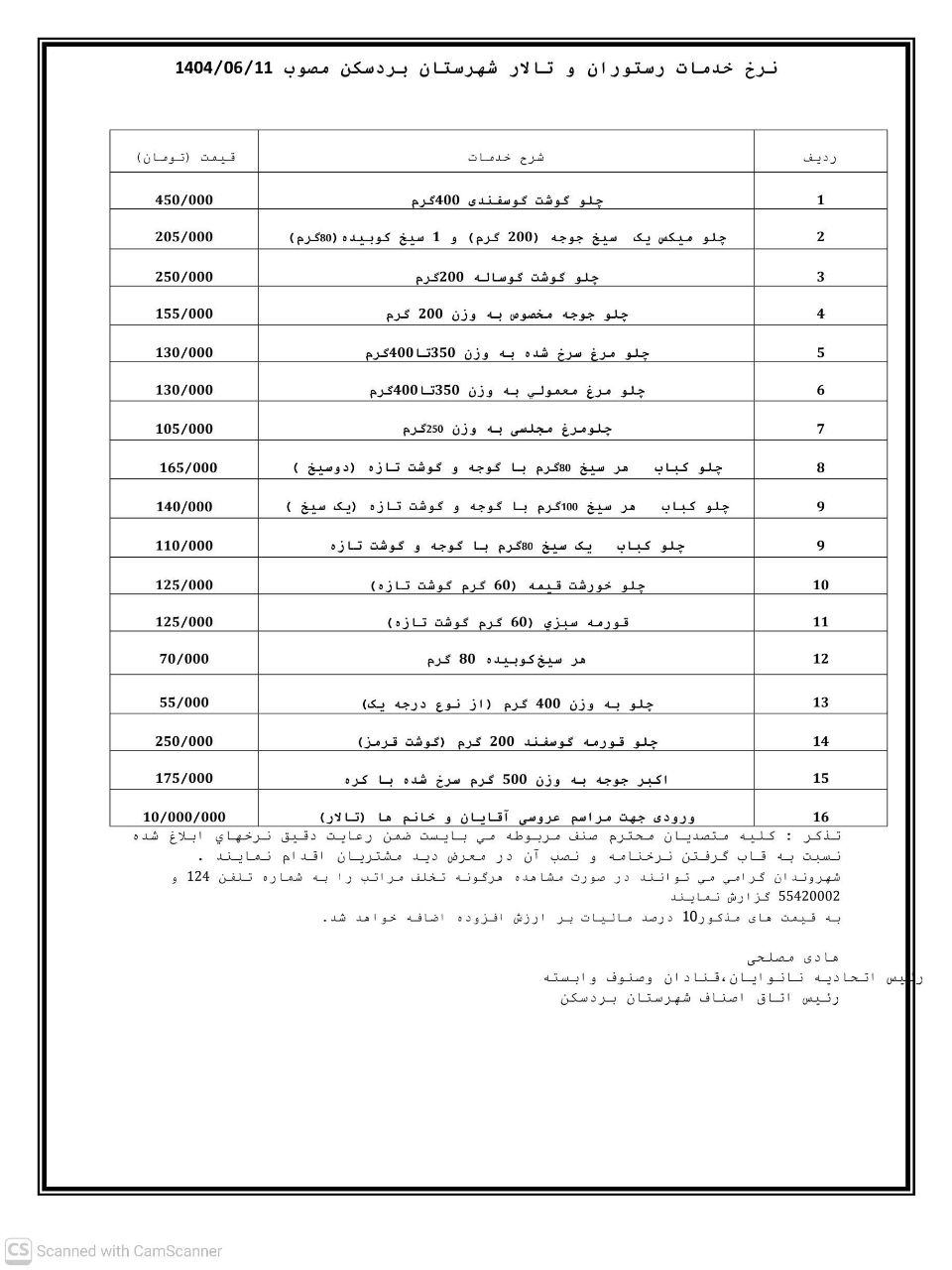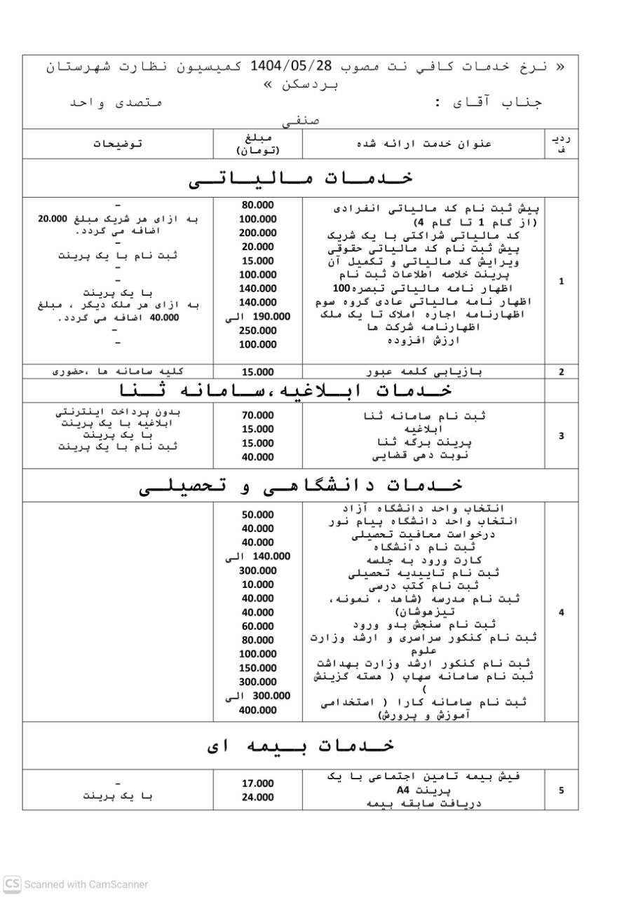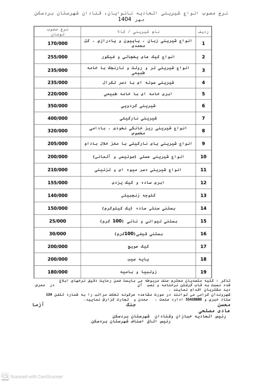 اعلام نرخ اتحادیههای شهرستان بردسکن در سال ۱۴۰۴